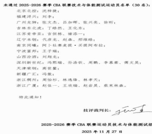 北京時(shí)間11月27日,CBA官方發(fā)布公告,本次CBA體測(cè)共有三十名運(yùn)動(dòng)員未通過(guò),需要補(bǔ)測(cè)。