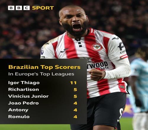 北京時(shí)間11月30日,英國(guó)媒體節(jié)目《Match of the Day》統(tǒng)計(jì)出了本賽季至今歐洲五大聯(lián)賽巴西球員射手榜,本輪英超完成梅開二度幫助布倫特福德主場(chǎng)3-1擊敗伯恩利的伊戈?duì)?蒂亞戈以11球斷檔領(lǐng)先,維尼修斯和安東尼上榜。