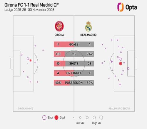 此役客場(chǎng)對(duì)陣赫羅納,皇家馬德里嘗試了25次射門,其中4次射正,最終僅打入一粒點(diǎn)球,1-1戰(zhàn)平對(duì)手。